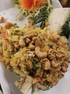 Primero hacer el arroz y dejarlo reposar. Cortar pollo, pimiento cebolla tomate. Vaciar la piña cortandola por la mitad y reservado para usar en la presentación. Sofreímos los langostinos y retiramos. En el mismo aceite …
